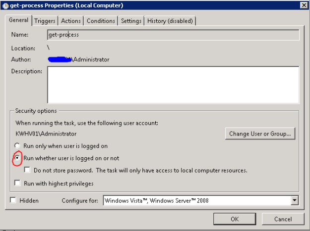 Important! You should set your task to run whether user is logged into a session or not… To do that do the folowing:
